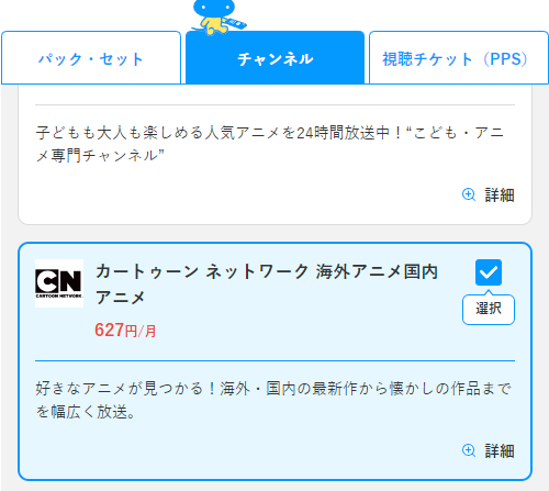 スカパーで契約するチャンネルは、627円の「カートゥーン ネットワーク」を選んでください。